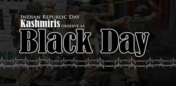 تفصیلات کے مطابق جموں کشمیر کے بڑے حصے پر غاصبانہ قبضے کیخلاف دنیا بھر میں مقیم کشیمری آج بھارت کے یومِ جمہوریہ کو یومِ سیاہ کے طور پر منارہے ہیں یوم سیاہ منانے کی کال جماعتی حریت کانفرنس نے دی ہے ، اہلیانِ کشمیر کا کہنا ہے عالمی برادری جان لے کے کشمیر کا بچہ بچہ اپنے مادرِ وطن پر بھارت کے جبری قبضے کو مسترد کرتا ہے، بھارت مقبوضہ وادی میں سنگین جنگی جرائم میں ملوث ہے، کشمیر کی آزادی تک چین سے نہیں بیٹھیں گے مقبوضہ وادی میں آج مکمل شٹر ڈاؤن ہڑتال ہے، احتجاجی مظاہرے اورریلیاں نکالی جائیں گی جبکہ بھارتی سفارتخانوں پر احتجاجی مظاہرے کیے جائیں گے کشمیرکونسل ای یوکے چیئرمین علی رضاسید نےاپنےویڈیو پیغام میں بتایاکہ یوم سیاہ منانےکامقصدنام نہاد بھارتی جمہوریت کی اصل تصویرکودنیا کےسامنےپیش کرناہے علی رضاسید کا کہنا تھا کہ انتہا پسند مودی سرکار کی ایماء پر کشمیری عوام پربدترین مظالم ڈھائے جا رہے ہیں،عالمی برادری اورانسانی حقوق کی تنظیمیں کشمیریوں کوبھارتی جبروتشدد سےنجات دلوائیںسابق وزیراعظم آزاد کشمیر سردار تنویرالیاس کہتےہیں بھارتی یوم جمہوریہ صرف ڈھونگ ہے مشیر صدر آزاد کشمیر ظریف خان نے عالمی برادری سے مسئلہ کشمیر کے حل کیلئے کرداراداکرنے کا مطالبہ کردیا ہے۔