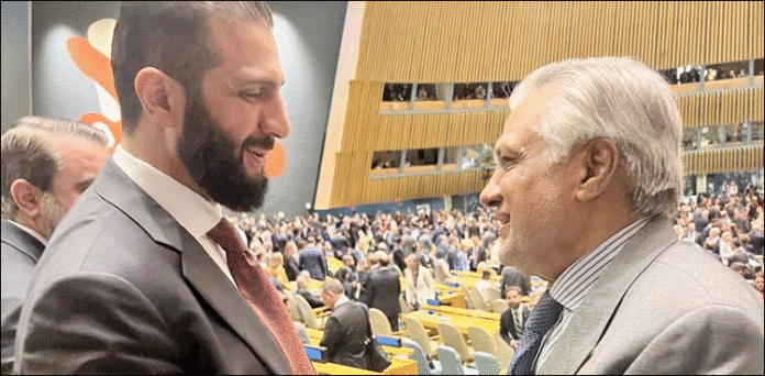 پاکستان کے نائب صدر اور وزیرِ خارجہ اسحاق ڈار کی اقوام متحدہ کی جنرل اسمبلی کے اجلاس کے دوران شام کے صدر احمد الشرع سے اہم ملاقات ہوئی۔تفصیلات کے مطابق اسحاق ڈار نے سماجی رابطے کی ویب سائٹ ایکس پر اپنے پیغام میں بتایا کہ یہ ملاقات خوشگوار ماحول میں ہوئی، جس میں دونوں ممالک کے تعلقات کو مزید مضبوط بنانے پر بات چیت کی گئی۔ ان کا کہنا تھا کہ احمد الشرع تقریباً چھ دہائیوں میں جنرل اسمبلی میں شریک ہونے والے پہلے شامی سربراہ ہیں۔ ملاقات کے دوران پاکستان کی جانب سے شامی عوام کے ساتھ مکمل یکجہتی کا اظہار کیا گیا۔نائب صدر اسحاق ڈار نے کہا کہ تجارت، انسانی سرمائے اور ترقی سمیت مختلف شعبوں میں تعاون کے ذریعے پاکستان اور شام کی تاریخی دوستی کو مزید گہرا کرنے کے عزم کا اظہار کیا گیا ہے۔واضح رہے کہ اسحاق ڈار نے نیویارک میں اقوام متحدہ کے ہیڈکوارٹرز میں او آئی سی کی خصوصی تقریب میں بھی شرکت کی، جہاں انھوں نے فلسطین، کشمیر اور اسلاموفوبیا جیسے مسائل کو اجاگر کرتے ہوئے کہا کہ مسلمانوں کے ناقابلِ تنسیخ حقوق کے تحفظ کے لیے او آئی سی کو مزید فعال کردار ادا کرنا ہوگا۔ انھوں نے امتِ مسلمہ میں باہمی تقسیم کے خاتمے کی ضرورت پر بھی زور دیا۔اس موقع پر نائب صدر نے کینیڈا کی وزیرِ خارجہ انیتا آنند سے ملاقات میں اقتصادی و تجارتی تعلقات کو مزید فروغ دینے پر اتفاق کیا۔ اسی طرح کامن ویلتھ وزرائے خارجہ اجلاس میں خطاب کرتے ہوئے انھوں نے کہا کہ دنیا ایک ہی وقت میں تنازعات، ماحولیاتی آفات، اقتصادی مسائل اور ٹیکنالوجی کے چیلنجز سے دوچار ہے۔ ان کا کہنا تھا کہ ماحولیاتی بحران کئی رکن ممالک کے لیے سنگین خطرہ ہے، جبکہ پاکستان ماحولیاتی طور پر دنیا کے سب سے زیادہ کمزور ممالک میں شامل ہے۔