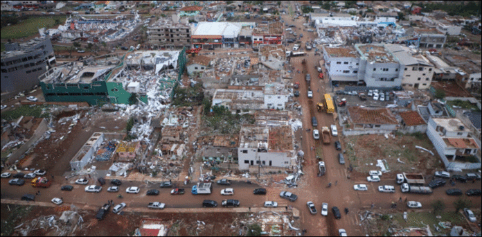 برازیل کی ریاست پارانا میں طوفانی بگولے نے قیامت ڈھا دی۔ 250 کلومیٹر فی گھنٹہ کی رفتار سے چلنے والی ہواؤں نے ریوبونیٹو شہر کو ملبے کا ڈھیر بنا دیامیڈیا رپورٹس کے مطابق برازیلی حکام نے ہفتے کے روز بتایا کہ جنوبی پارانا میں طاقتور آندھی (ٹورنیڈو) نے ریوبونیٹو کو بالکل تباہ کر دیا، جس کے نتیجے میں کم از کم 6 افراد ہلاک اور تقریباً 750 زخمی ہوئےانتہائی تیز رفتار اور خوفناک ہواؤں نے درخت اکھاڑ دیے، درجنوں گاڑیاں تباہ کر دیں، مواصلاتی نظام درہم برہم ہو گیا، اور کئی علاقے اندھیرے میں ڈوب گئے، ہزاروں افراد بے گھر ہو گئےیہ طوفان جمعہ کی شام آیا، پارانا کی اس ریاست میں ریوبونیٹو کی آبادی تقریباً 14 ہزار ہے۔ حکام کے مطابق طوفان نے چند ہی منٹوں میں گاڑیوں کو کھلونوں کی طرح الٹ پلٹ دیا اور عمارتوں کو ملبے کے ڈھیر میں بدل دیاطوفان صرف چند منٹ جاری رہا، مگر ہواؤں کی رفتار 250 کلومیٹر فی گھنٹہ (155 میل فی گھنٹہ) تک تھی۔ فضائی تصاویر میں قصبے کا زیادہ تر حصہ ملبے میں تبدیل دکھائی دیاہفتے کو متاثرہ باشندے اپنے گھروں کے ملبے میں سے کچھ باقی ماندہ سامان تلاش کرنے کی کوشش کر رہے تھے۔ حکام کے مطابق قصبے کے 90 فیصد علاقے کو نقصان پہنچا ہےپارانا کی سول ڈیفنس ایجنسی کے سربراہ نے کہا کہ منظر کسی جنگ کے جیسا لگتا ہے اور مزید ہلاکتوں کا امکان ہے۔ محکمہ موسمیات نے خطرناک طوفانی موسم کا الرٹ جاری کیا ہے، تیز ہواؤں، بارش اور ژالہ باری سے کئی شہروں کو نقصان پہنچنے کا خدشہ ہےگزشتہ سال بھی برازیل کے جنوبی حصے میں شدید سیلاب آیا، جس میں 200 سے زائد افراد ہلاک اور 20 لاکھ بے گھر ہوئے، خاص طور پر ریو گرانڈی دو سل ریاست میں۔ ماہرین کے مطابق عالمی حدت (گلوبل وارمنگ) نے ان آفات میں اہم کردار ادا کیا۔