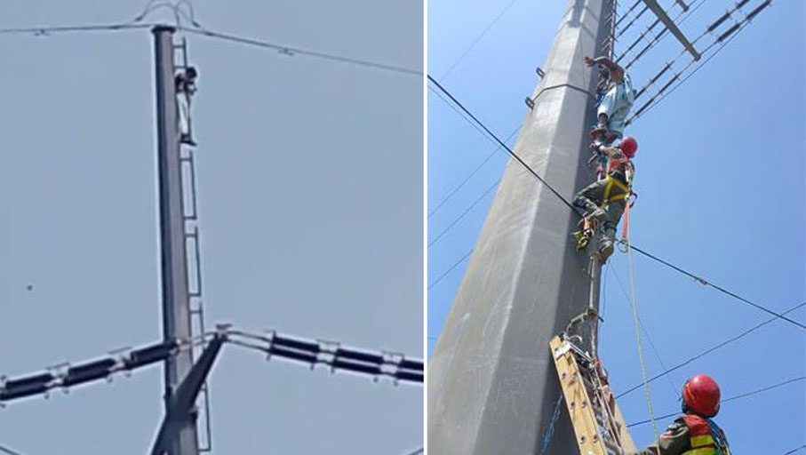 ریسکیو حکام کا کہنا ہے کہ ہائی ٹینشن لائن پر چڑھنے والے شخص کی شناخت رحیم کے نام سے ہوئی ہے، جو مبینہ طور پر نشے کی حالت میں تھا۔